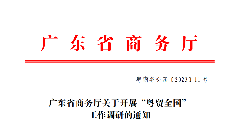 近日,广东省商务厅发布关于开展“粤贸全国” 工作调研的通知,以"粤贸全国品牌工程"的一个具体抓手,通过“粤贸全国”系列活动支持广东企业积极开拓国内市场,深化对内经济联系,进一步提高广东企业的市场竞争力和广东产品的美誉度,为新发展阶段广东打造新发展格局战略支点提供贸易高质量发展方面的有力支撑。