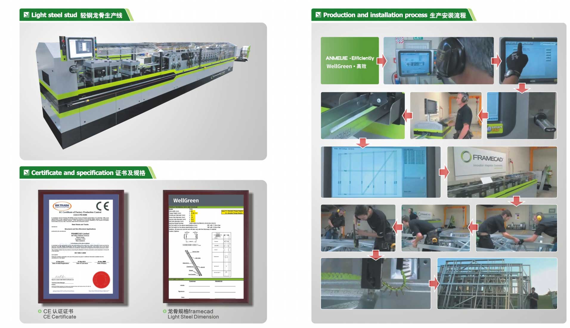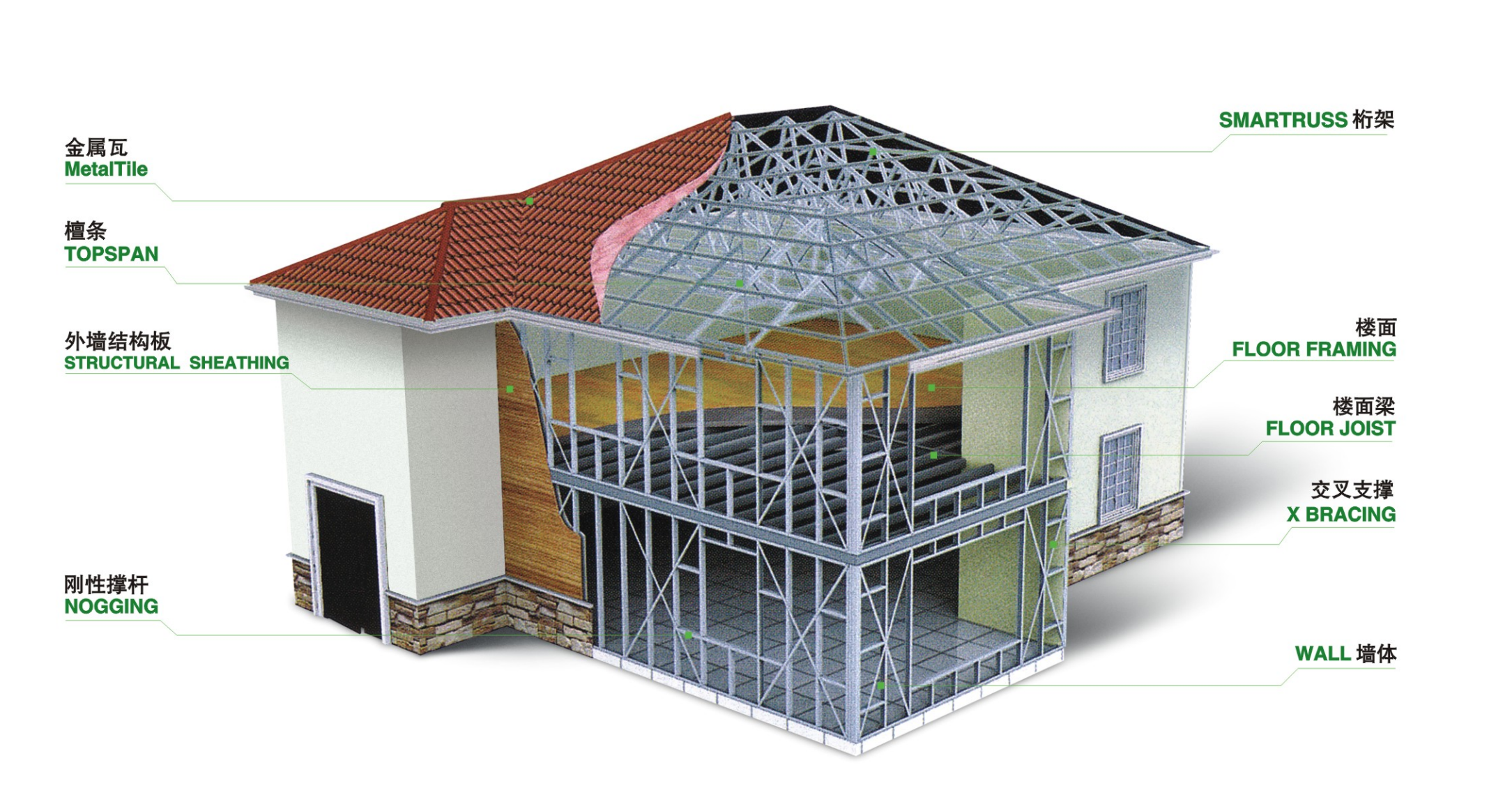 具有自重轻、跨度大、抗风抗震性能好,保温隔热、隔声等各项指标卓越的特点,是一种高效、节能、环保、符合可持续发展方针的绿色建筑体系。适用于别墅、多层住宅、度假村、会所等民用建筑、及建筑加层、屋顶平改坡、轻质内隔墙、外围护墙等。WellGreen提供预拼装的出 口房屋,墙体包括事先安装好的外墙围护、保温和窗户。屋架系统也可以预拼装的形式供应给客户,与传统的建筑方式相比大大加快了现场 安装的时间。